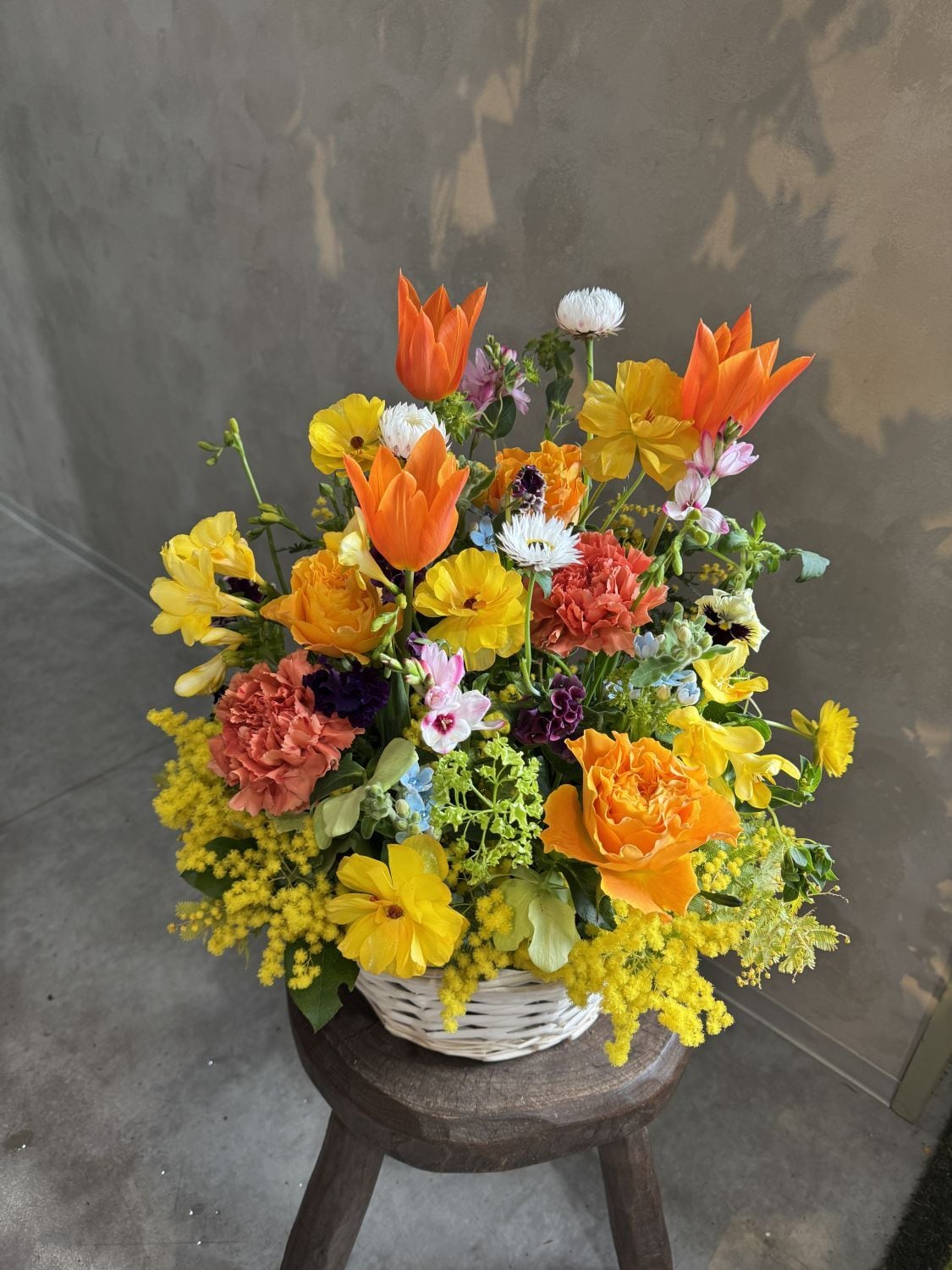 この生花アレンジメントは、季節ごとに異なる花々を使用し、楽しさと美しさを兼ね備えています。花々の持つエネルギーが、見る人の心を軽やかにし、素敵な空間を創出します。